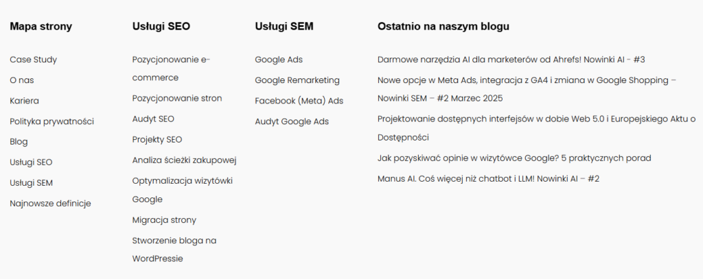 Mapa strony internetowej ma także duży wpływ na jej pozycjonowanie. Dlatego warto ją mieć (oraz wgrać do Google Search Console), kiedy planujesz rozpocząć działania SEO na stronie. Mapa witryny jest bardzo przydatna przy linkowaniu wewnętrznym, które jest jednym z ważnych elementów w procesie pozycjonowania.