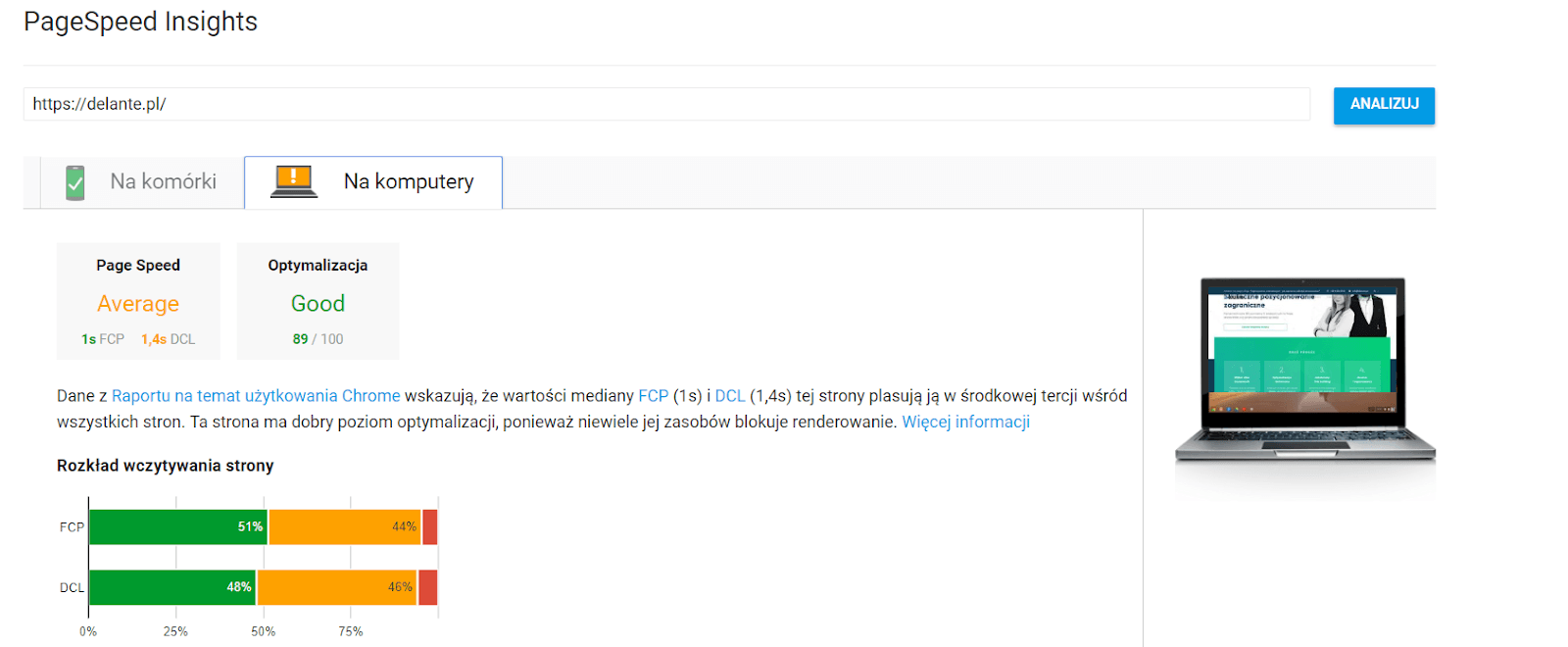 Narzędzie posługuje się skalą punktową od 0-100, a im wskaźnik wyższy, tym lepiej. Powyżej 85/100 strona oceniana jest bardzo dobrze. Zauważysz pewnie, że Twoja strona na desktop będzie miała lepszą ocenę niż ta na komórki – to bardzo częste i – ze względu na specyfikę urządzeń mobilnych – normalne. Pracuj więc mocno ze wskazówkami na mobile i szybko zobaczysz efekty.