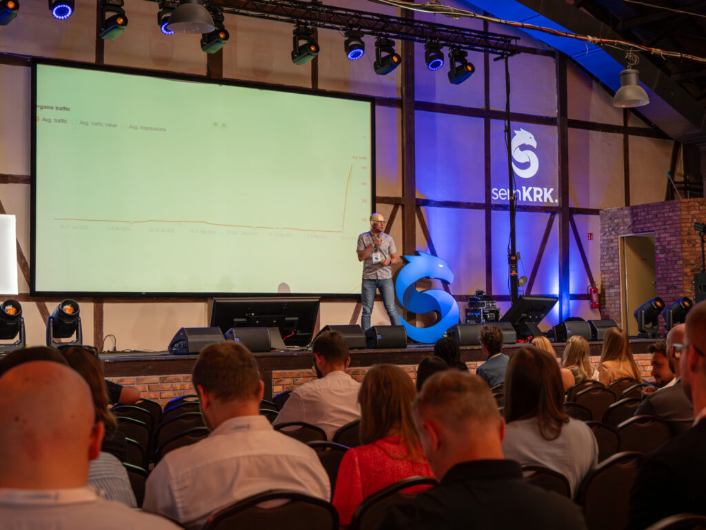 Zacznijmy od części merytorycznej – przeglądu prelekcji, które odbyły się na tegorocznym semKRK. Część merytoryczna została podzielona na cztery segmenty, w tym jeden anglojęzyczny, a dobór prelegentów był na wysokim poziomie. Mogliśmy zobaczyć zarówno lokalnych weteranów, takich jak Sebastian Heymann, ale również specjalistów występujących międzynarodowo, na największych konferencjach – na przykład Marka Williams-Cooka, którego prelekcję o grach wideo i exploitach w SEO część zespołu miała już przyjemność obejrzeć na kwietniowym Brighton SEO 2025.