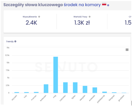 Potrzebujesz przykładu, jak rozplanować swoje działania? Weźmy aptekę internetową. Już na kilka miesięcy przed sezonem letnim zacznij pracę nad takimi kategoriami jak kremy z filtrem SPF, środki na komary, preparaty łagodzące po oparzeniach, opatrunki, plastry czy środki do dezynfekcji ran. Nie wiesz, jakie produkty i zagadnienia będą cieszyć się popularnością w danym okresie? Sezonowość słów kluczowych możesz sprawdzić na przykład w takich narzędziach jak Senuto czy Google Trends.